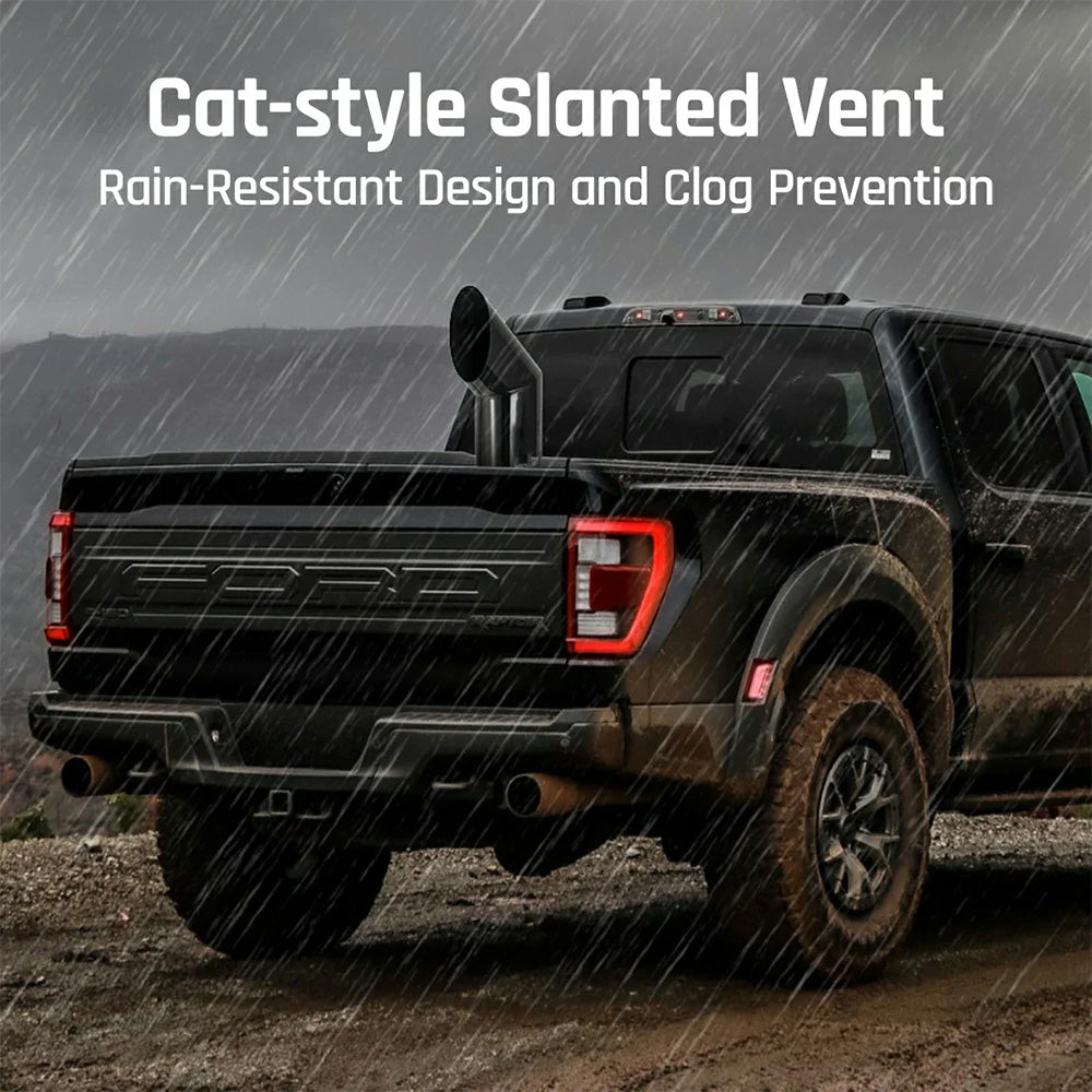 - Cat-Style Angled Top: Prevents rain from entering the exhaust system while maintaining a classic stack appearance.