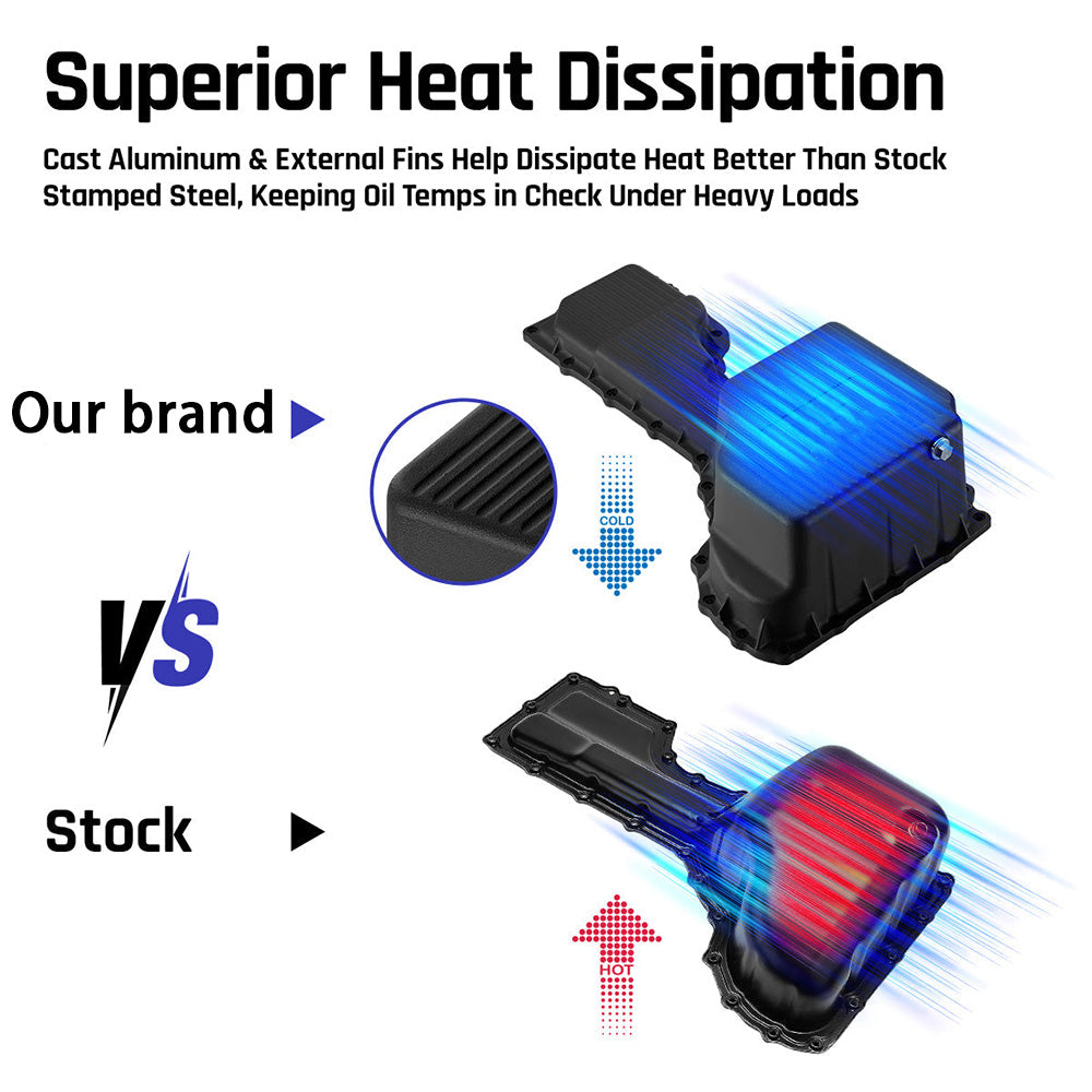 Cast aluminum with external cooling fins increases surface area, effectively lowering oil temperature compared to stock steel pans. -