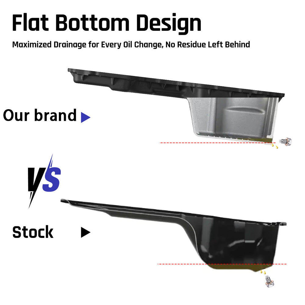 Flat-bottom design ensures complete oil evacuation during oil changes, preventing sludge buildup. -